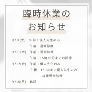 ブログ 9月の休診のご案内 【9月の休診のご案内】 9/9(火) 午前:優人先生のみ 午後:通常診療 9/11(木) 午前:通常診療 午後:15時30分までの診療 9/12(金) 午前:優人先生のみ 午後:15:30まで優人先生のみ 以後通常診療 9/15(月) 休診 SHAREシェアする ブログ一覧
